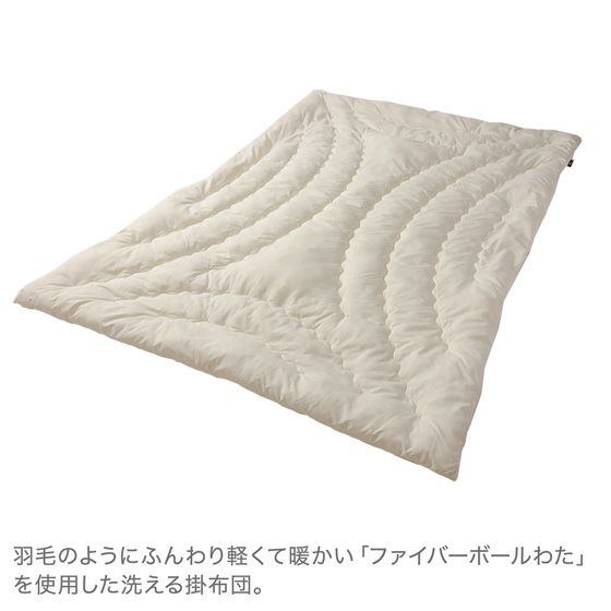 羽毛のようにふんわり軽くて暖かい、ファイバーボールわたの洗える掛布団。本体には、抗菌防臭加工と匂いが気にならない部屋干し加工を施し、丸洗いできるのでいつも清潔です。高密度310本のしなやかな風合いだから、カバーをかけずに使えます。体に沿うフィットキルトも嬉しいポイントです。