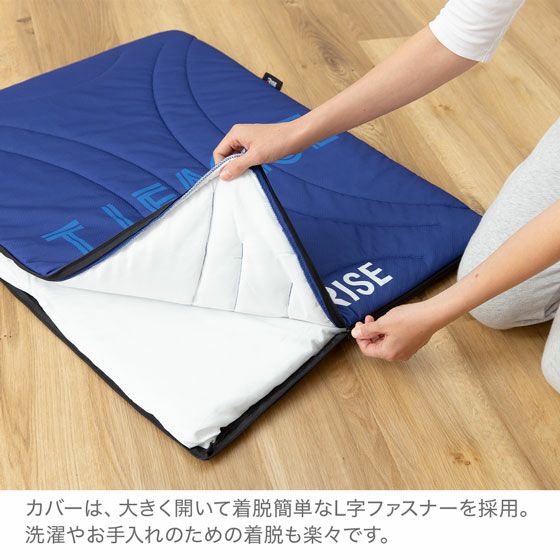 T.LEAGUEとコラボデザインのモバイルパッドです!出張やご旅行、スポーツの遠征、移動中にも便利な、コンパクトで持ち運びしやすいモバイルタイプです。中材にマットレスと同じ高反発ファイバーを採用しました。ホテルでの就寝時にはもちろん、長時間の移動にはお尻に敷いてご使用いただけます。裏面はすべりにくいノンスリップ加工。