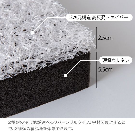 復元性と耐久性に優れ、水洗いできる3次元高反発ファイバーと硬質ウレタンの中材を裏返すことで、2種類の寝心地を体感できます。