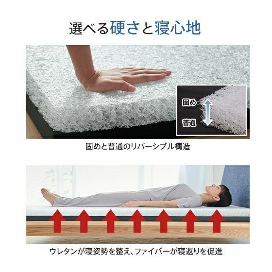 寝姿勢を保持する185ニュートンの硬質ウレタンに、優れた反発弾性で寝返りを促進するファイバー素材を重ねた2種の高反発素材によるハイブリッド構造の動的睡眠マットレスと、大人気の寝返りサポート枕のセットです。体圧分散性能にも優れた安心の厚さ9cmで、床に直敷きでも、ベッドマットレスとしてもご使用いただけます。通気性抜群で洗えて清潔なファイバー素材は、ライズマットレス史上初の、『固めと普通のリバーシブル構造』。3分割タイプだから、ウレタンとの組み合わせで8通り以上の寝心地を可能にした、オーダーメイド感覚の快適高反発マットレスです。睡眠の質向上をサポートするファイバー素材の相乗効果で、高反発の寝心地を十二分に体験いただけるライズ一押しの高反発寝具セットです。