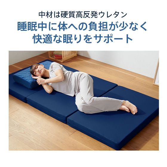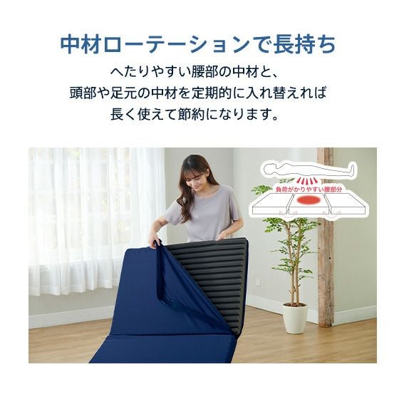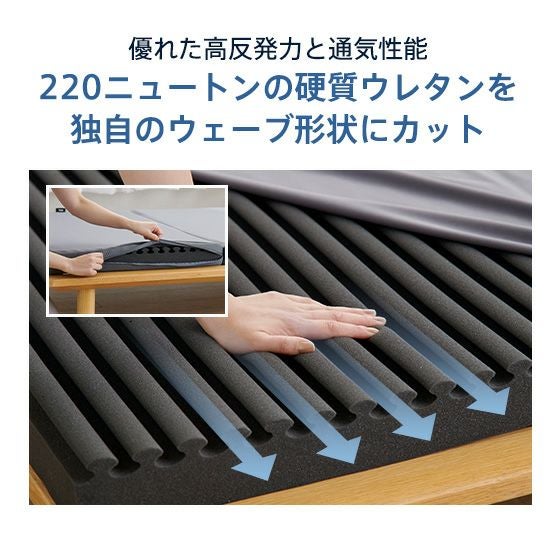 220ニュートンの硬質ウレタンを、ライズ独自のウェーブ形状にカットした高反発マットレスです。身体をしっかりと支える7cmの厚みで、寝心地の良さを保ちながら、自然な寝姿勢と寝返りをサポートして、腰痛対策にもおすすめです。お使いのベッドに重ねても、床やフローリングに直置きしても使えます。シングル約4.0kgと軽量、折りたためる3つ折り仕様で収納しやすいため来客用にも便利です。