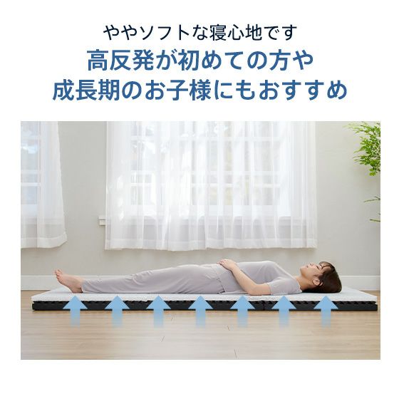 2層構造のハイブリッド高反発マットレスです。寝姿勢を保持する210ニュートンの硬質ウェーブウレタンと、通気性抜群で水洗いも可能な高反発ファイバーを組み合わせ、ソフトな寝心地を実現しました。高反発が初めての方や、興味はあるけど固すぎないか不安という方にも安心です。中材を入れ替えれば、4通り以上の寝心地が楽しめます。