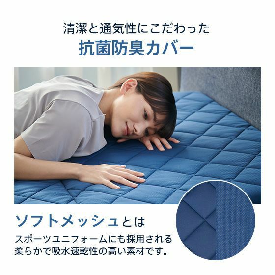 マットレスは、中材の密度を高め睡眠の質向上にフォーカスした高反発マットレス。一般の方はもちろん、アスリートにもおすすめです。寝姿勢と寝返りをサポートする高反発力で、1枚でも、お使いのベッドに重ねても使えます。中材は洗える高反発ファイバー、さらに、カバーに抗菌防臭加工と吸水速乾加工を施し、清潔機能にもこだわりました。