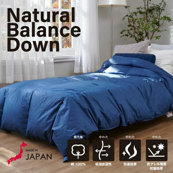 掛け布団は、”自然の力で睡眠環境を整える” ホワイトグースダウン使用の掛布団です。 自然の水鳥はカラダの温度と湿度を快適な状態に保つために、ダウンとフェザーの容積比率は50%:50%(重量比率 20%:80%)と言われています。 ライズ ナチュラルバランスダウンは、この比率通りの自然にやさしい設計により調湿効果を高めました。また、保温性を重視するために廃棄されてしまうフェザーをあえて採用することで、SDG’Sにも貢献します。