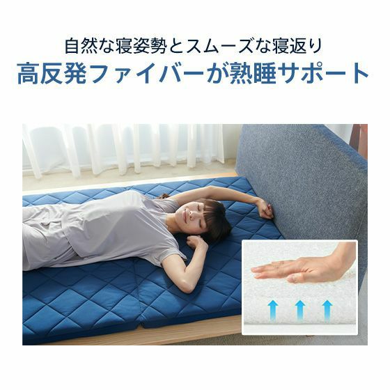 マットレスは、中材の密度を高め睡眠の質向上にフォーカスした高反発マットレス。一般の方はもちろん、アスリートにもおすすめです。寝姿勢と寝返りをサポートする高反発力で、1枚でも、お使いのベッドに重ねても使えます。中材は洗える高反発ファイバー、さらに、カバーに抗菌防臭加工と吸水速乾加工を施し、清潔機能にもこだわりました。