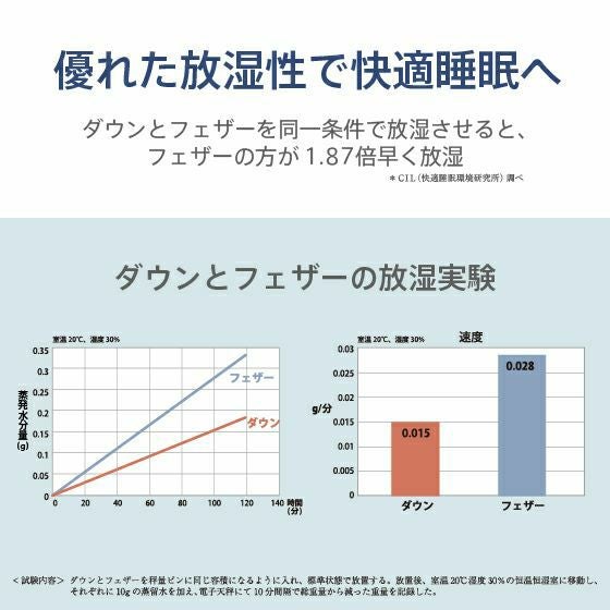 自然の水鳥はカラダの温度と湿度を快適な状態に保つために、ダウンとフェザーの容積比率は50%:50%(重量比率 20%:80%)と言われています。