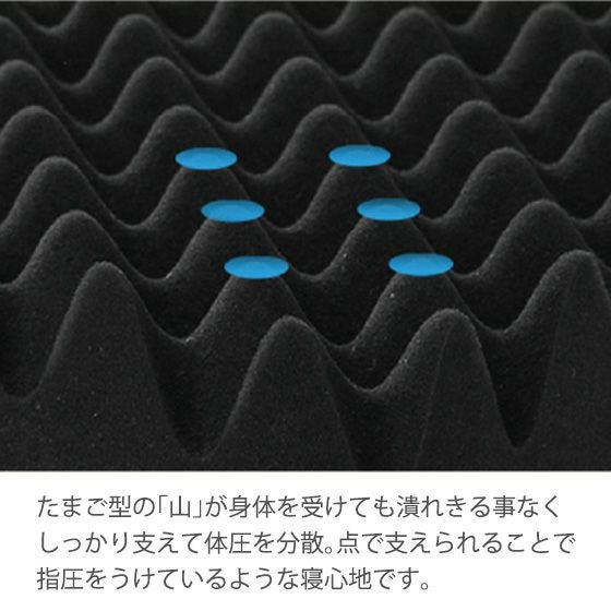 180ニュートンの硬質ウレタンを、たまご型にカットした高反発マットレスです。6cmの厚みで、お使いのベッドマットレスに重ねてトッパーとしても使用できます。
