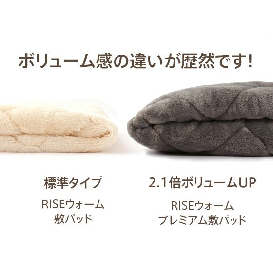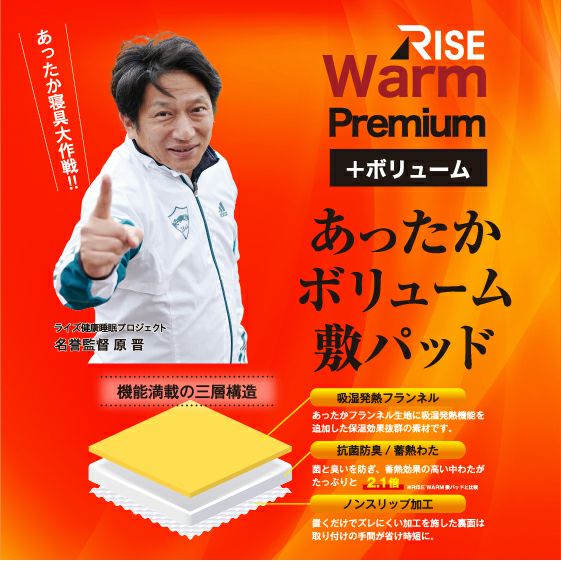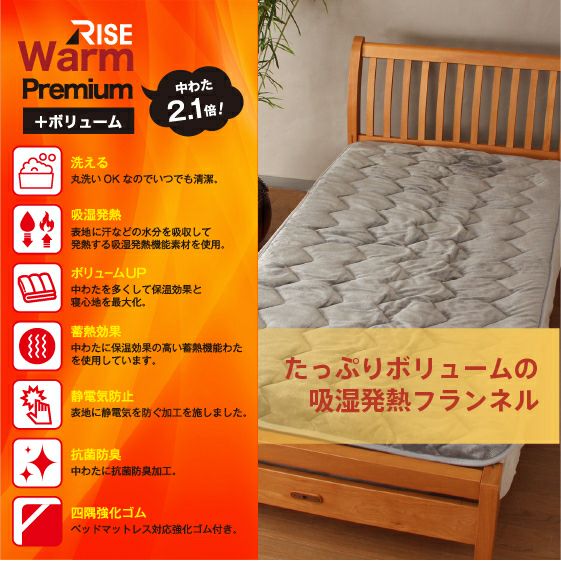 汗などの水分を吸収して発熱する吸湿発熱フランネル素材、 RISEウォーム敷パッドの約2.1倍のボリュームのあったか敷パッドです。蓄熱機能と抗菌防臭機能を持ち合わす中わたを採用、肌にあたる面には静電気防止加工を施しました。寒いシーズンもより暖かく、