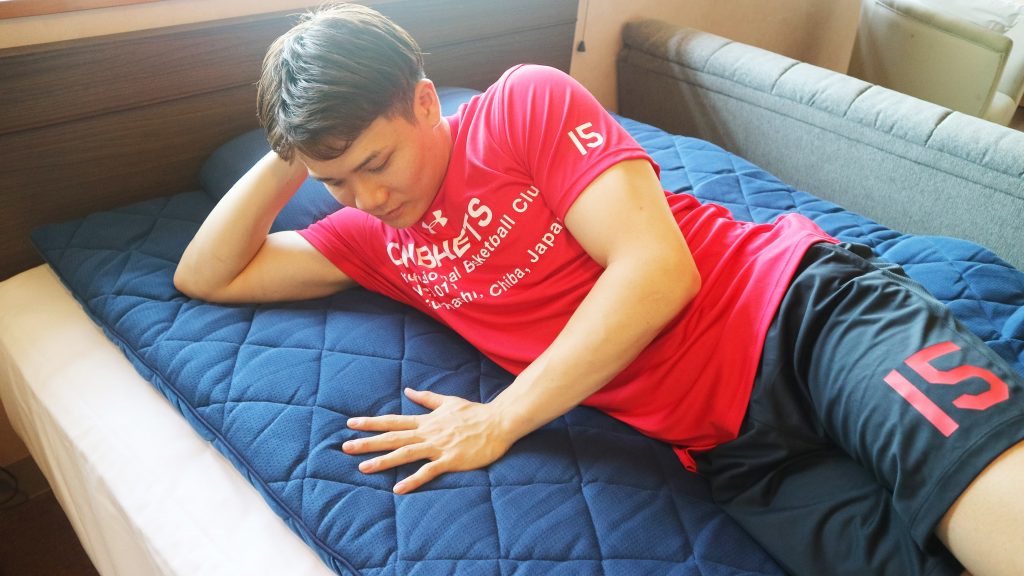 合宿先は、国内外のナショナルチームが多数利用する有名な施設です。当然ながら、ベッドも有名ブランドのセミダブルサイズが導入されていましたが、ベッドに重ねるだけで手軽に使えるところが人気のスリープオアシス マットレスパッドを敷いてみると、やはり沈み込みが少なく、身体が楽に感じると藤永佳昭選手。とても喜んでいただきました。トレーニング、頑張ってください!