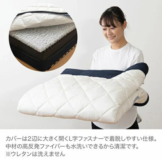 高反発が初めての方に最適、ソフトな寝心地の2層構造マットレス。寝姿勢をサポートする厚さ4cmのたまご型プロファイル硬質ウレタンに、優れた弾力性でスムーズな寝返りを促進する厚さ2.5cmの高反発ファイバーを重ねました。中材を入れ替えることで、お好みに合わせて4通り以上の寝心地が楽しめます。 軽量で収納やお手入れが楽、水洗いできるファイバーだから清潔な点も魅力です。