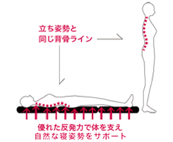 高い反発力で全身をバランスよく支えることで、自然な背骨ラインを描き、理想の寝姿勢を保つことができます。