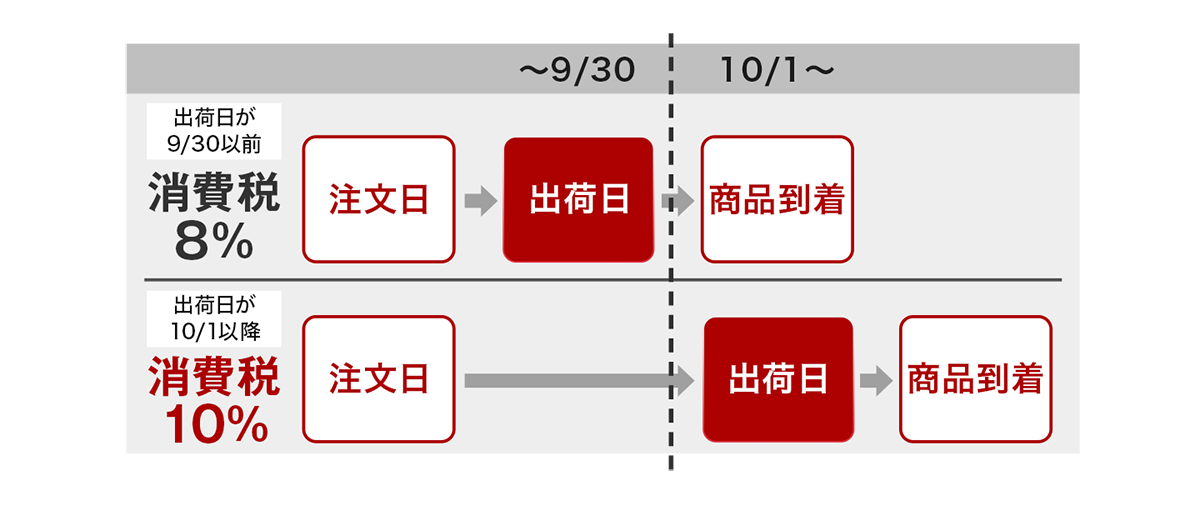 9月中にご注文いただいた場合でも、10/1(火)以降にご注文内容に変更があった場合、新税率が適用される場合があります。